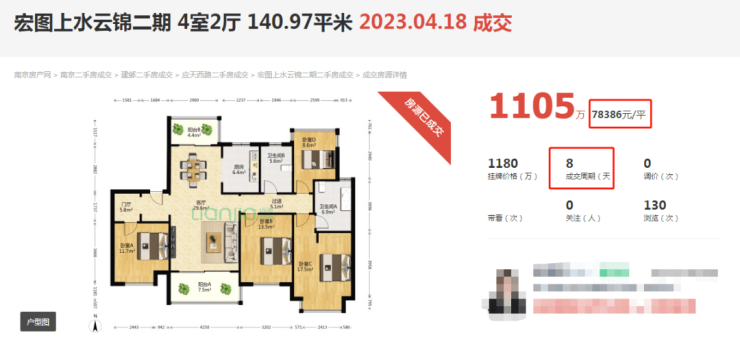 根据链家显示,今年以来仅在该平台上,宏图上水云锦就成交了8套房源,其中有3套户型面积130平左右的房源,总价都在900万以上,最快的成交周期仅有4天。