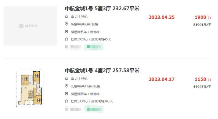 近期城中也成交了不少豪宅,比如中航金城一号在4月就接连成交了两套总价1000万以上的房源,其中一套232平的房源成交总价1900万!成交周期也仅有45天。据悉这套房源为顶层复式住宅,成交单价达81661元/㎡,创小区最高成交单价记录。
