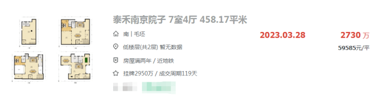 泰禾南京院子在3月成交了一套458平的房源,总价2730万,单价59585元/平。同样这套房源也是降价成交,原本挂牌价为2950万,最终成交价便宜了220万。