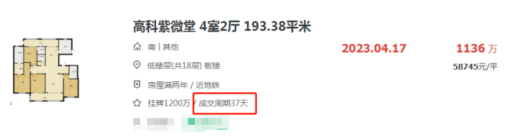 4月,仙林湖神盘高科紫微堂成交一套房源,建面约193.38㎡,成交总价1136万,折合单价约58745元/㎡。成交周期仅37天!