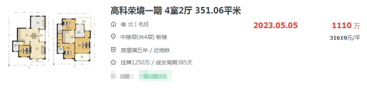 5月,高科荣境一期成交了一套351平的房源,成交总价1110万!