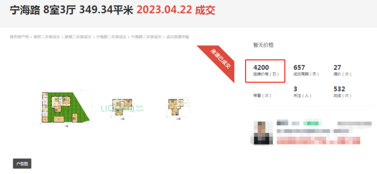宁海路一套国民别墅成交,是一套建面约350㎡的八居室,挂牌价高达4200万,据悉最终降到3500万成交,成交单价超10万/平 !
