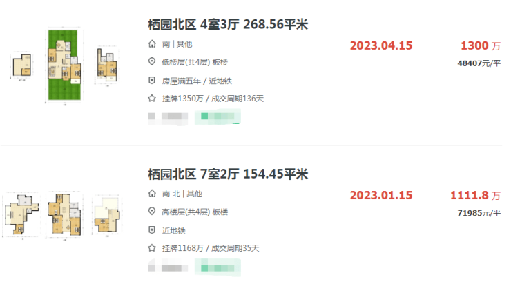 4月15日,仙林中心的栖园北区,成交了一套建面约268.56㎡房源,成交总价1300万,成交单价48407元/㎡,成交周期136天。此外该小区在1月也成交了一套总价1111.8万的顶复房源,面积154.45平,单价更是高达71985元/平!