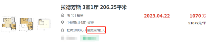 其中拉德芳斯在4月22日成交了一套206平房源,成交总价1070万,折合单价51879元/平,重要的是,成交单价仅有1天!
