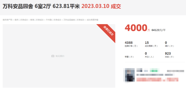 万科安品园舍在3月成交了一套总价高达4000万的房源,面积623.81平,单价64123元/平,成交周期15天,值得注意的是,这套房源挂牌价是4388万,最终降价388万才成交。