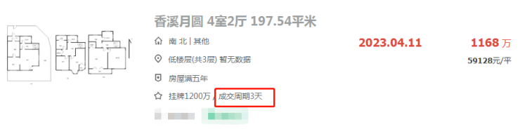 4月11日,香溪月圆成交一套建面约197.54㎡二手房,成交总价1168万,成交单价59128元/㎡,成交周期仅有3天!