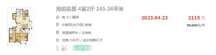 海玥名都接连成交了两套总价千万的房源,一套182.46平的房源总价1648万,折合单价超9万/平,另一套245平的房源,单价为8.62万/㎡,总价高达2115万!