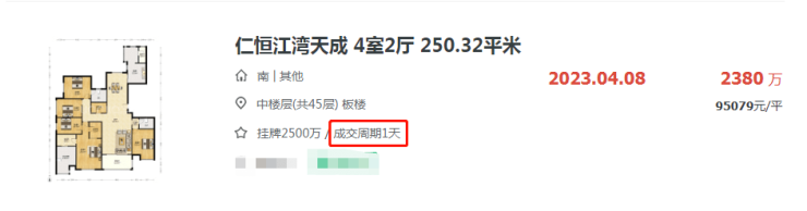 湾四也在上个月成交了一套250平的房源,总价高达2380万,单价超9.5万/平!同样成交周期也只有1天!