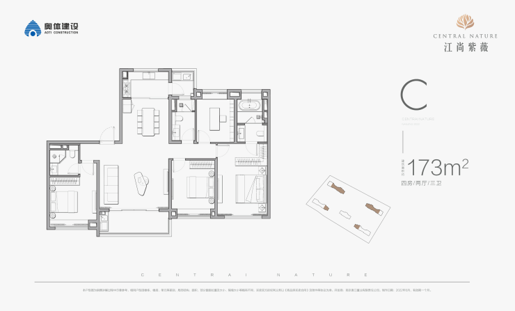 建筑面积约173㎡C户型,从“整体设计”的营造理念出发,将U型厨房、餐厅、开阔客厅、阳台等功能空间,有序串联在一起,创造高频互动的家庭中心,更增加了北向家政阳台,将晾晒与观景功能分开,确保生活享受的纯粹性。此外,全屋中央空调、新风系统、地暖系统……以精工细节升华品质,构建生活。