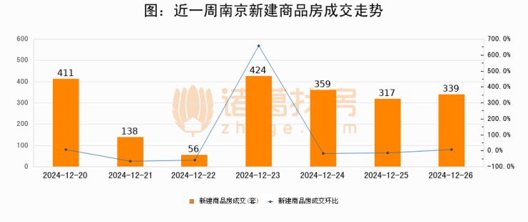 根据南京市住房保障和房产局数据显示,2024年12月26日南京新建商品房成交339套,较昨日增加22套,环比上涨6.9%