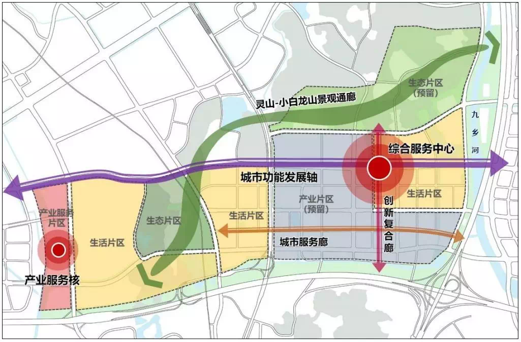 ● 三廊 灵山-小白龙山景观通廊,经九路创新复合廊(预留),纬八路城市服务廊(预留);