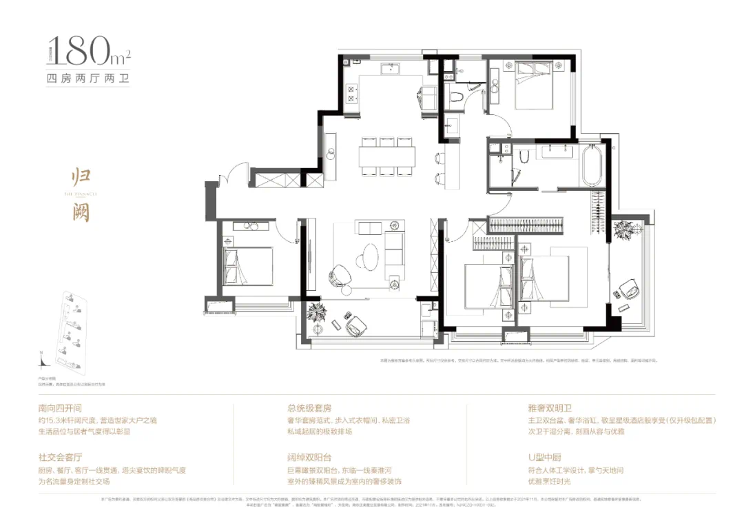南向四开间,约15-15.3米阔绰面宽,相较同类产品+1米的苛求,将窗外美景尽揽眼底;拥巨幕瞰景双阳台,东临一线秦淮河;客餐厅一体设计,约5.4米大面宽,打造墅级标准下的大宅之道;U型厨房设计,符合人体工学动线,衔接餐厅,营造家庭欢聚PARTY;豪华套房主卧,步入式衣帽间、卫浴间,180㎡户型更享双台盆、奢华浴缸配置,将精致人居贯彻得酣畅淋漓。