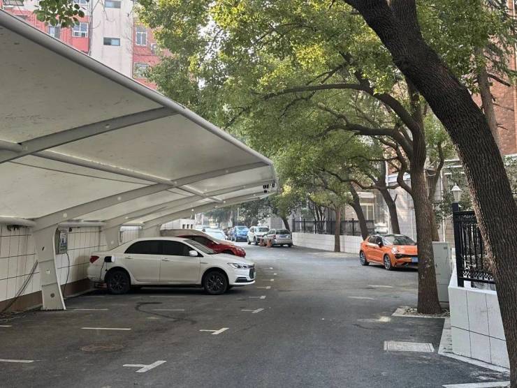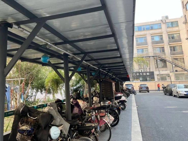 道路、绿化变了样,路灯、监控全覆盖。经过优化之后,停车位从原先的300多个增加到约500个,非机动车棚不是翻新就是扩建,而且个个都有充电桩和喷淋设备。最贴心的是,公共空间增加了助残设施和宣传栏、坡道两侧有了扶手、部分机动车停车位安装了车棚,而空调冷凝管更是覆盖到了每一个楼栋。