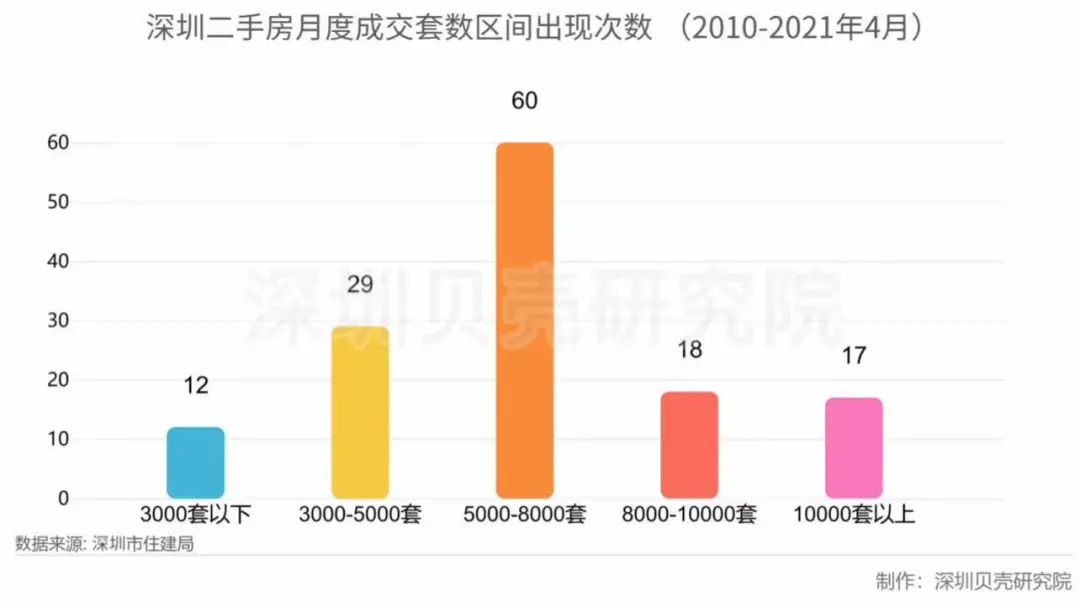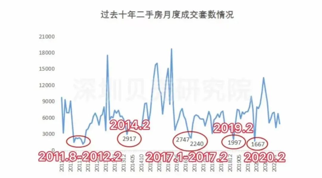 据深圳贝壳研究院统计,近十年深圳二手房月度成交在3000套以下的月份仅12次,最近的一次是2020年2月。