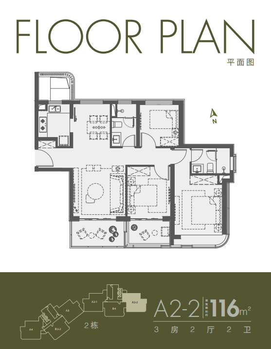116㎡三房两厅两卫户型,主卧套房设计,南向面宽约9米,带有弧形飘窗,增加了采光面;餐厅、阳台均为落户窗设计;北向次卧为可变空间,业主可以根据自身需求打造成书房、收纳间等。