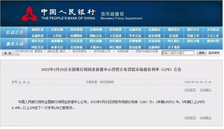 5月20日一早,中国人民银行授权全国银行间同业拆借中心公布:即日起贷款市场利率报价(LPR)调整为:1年期LPR为3.7%,5年期以上LPR为4.45%!