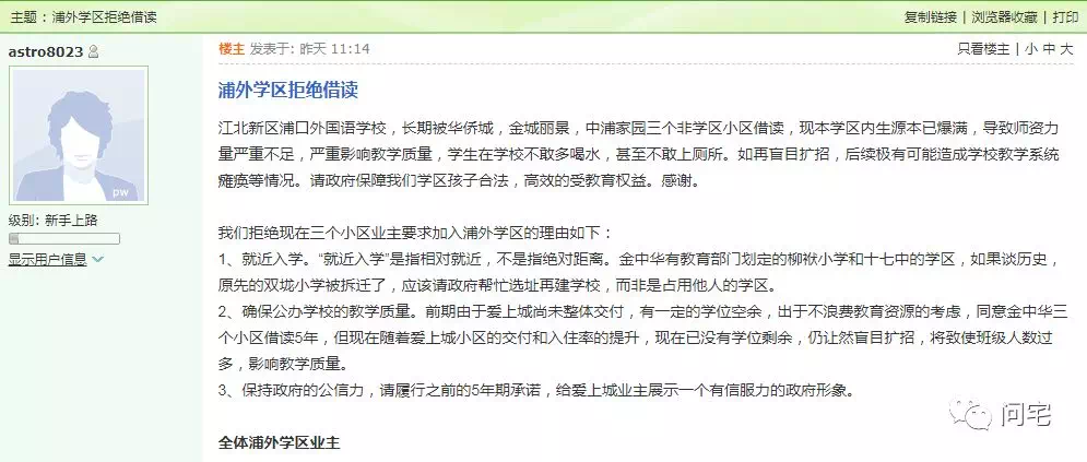 昨日,目前浦外学区业主在南京网络问政平台上发起了“浦外拒绝借读”的呼声。