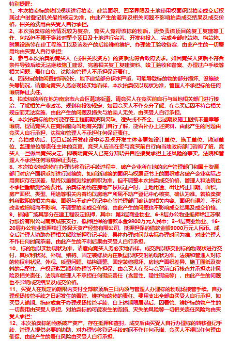 由于福润广场的情况较为复杂,拍卖的公告发布了12条特别提醒。从中不难看出,因闲置时间较长,福润广场部分设施已经缺失、损坏。此外,福润广场部分在建工程设定了抵押。
