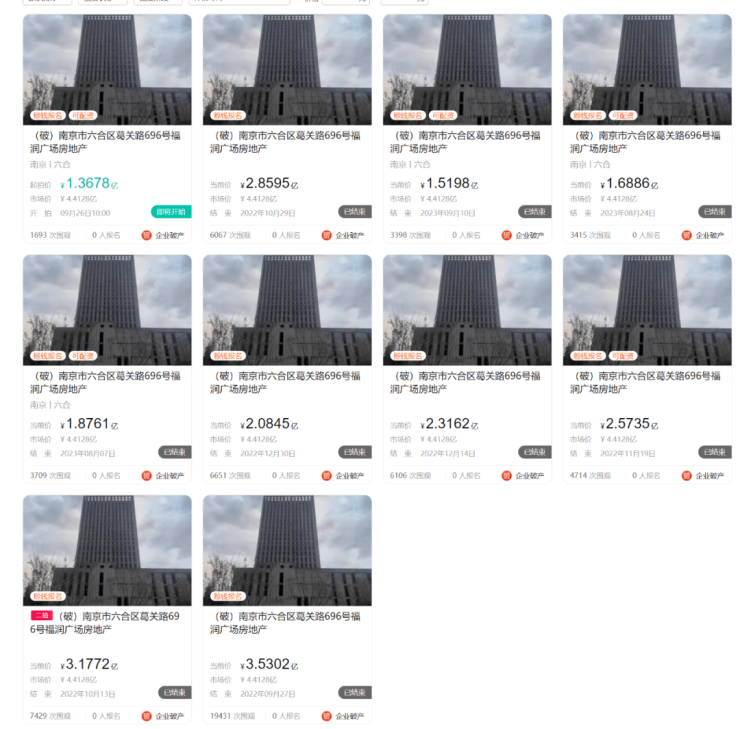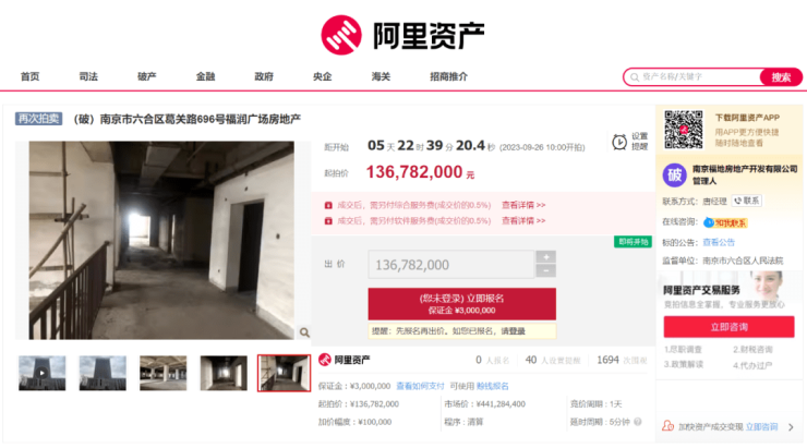 福润广场自2022年9月至今,已经进行了9次拍卖,也流拍了9次,价格从3.5亿一降再降,仍无人接手。