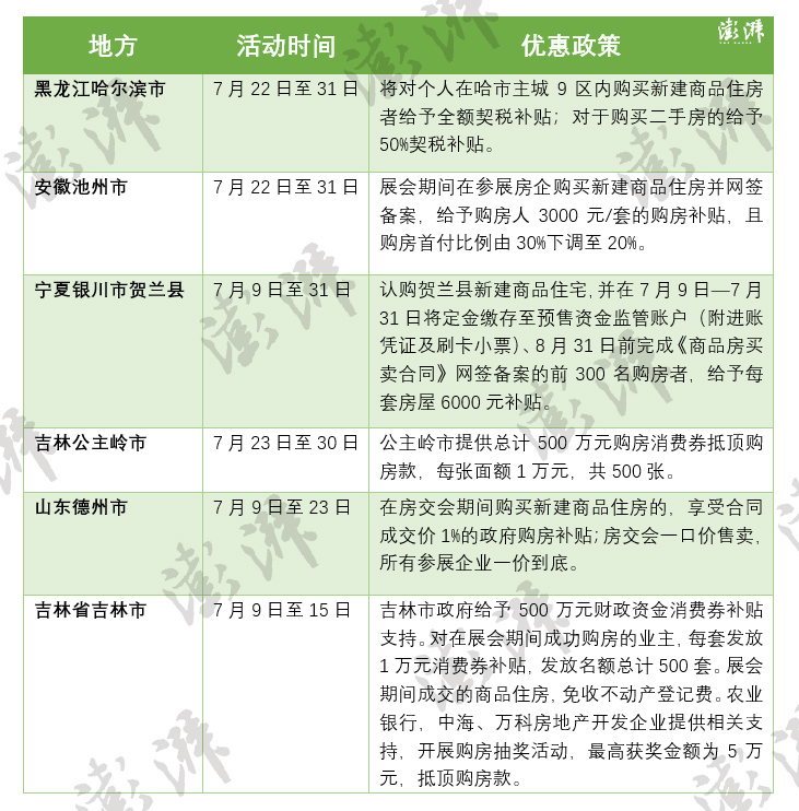 据澎湃新闻不完全统计,仅7月,就有至少包括黑龙江哈尔滨市,安徽池州市,宁夏银川市贺兰县,吉林公主岭市、吉林市,山东德州市等地开展房展会。房展会期间,多地政府推出优惠活动,包括契税补贴、购房补贴、发放消费券、下调首付比例等助力房企销售。