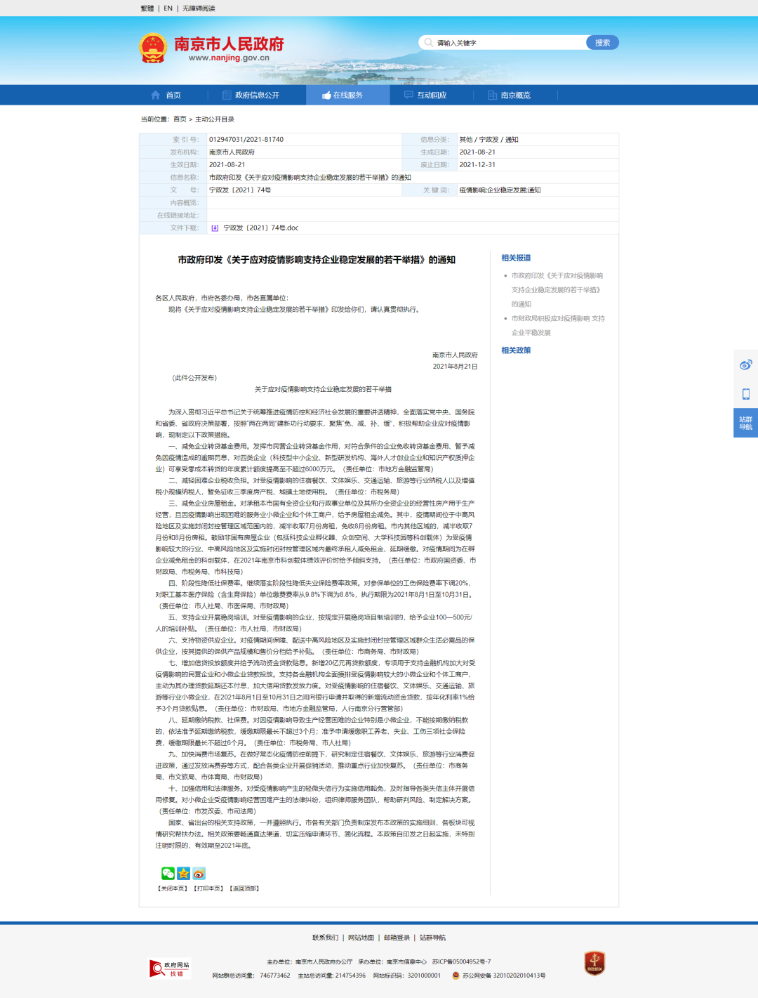 为深入贯彻习近平总书记关于统筹推进疫情防控和经济社会发展的重要讲话精神,全面落实党中央、国务院和省委、省政府决策部署,按照“两在两同”建新功行动要求,南京市政府在广泛调研基础上,研究出台《关于应对疫情影响支持企业稳定发展的若干举措》,助力市场主体恢复元气、增强活力。