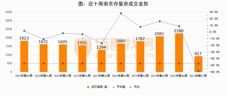 存量房方面,第06周南京存量房成交927套,较上周减少1333套,环比下降59%。从近十周成交走势来看,周均成交套数为1662套,本周低于平均水平44.2%。
