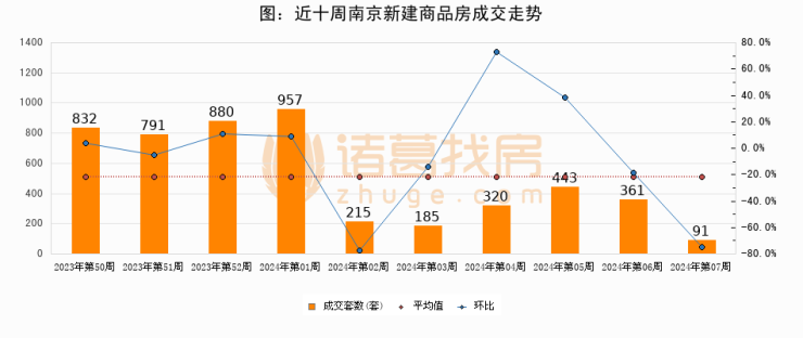 进入2024年第06周(02月05日-02月11日),南京新建商品房成交91套,较上周减少270套,环比下降74.8%