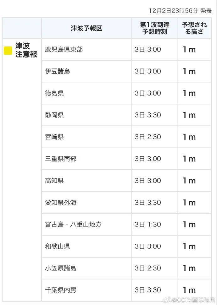 受菲律宾近海强震影响,日本气象厅于当地时间12月2日晚上11点56分(北京时间晚上10点56分)发布海啸预警,警报覆盖范围自日本本州岛千叶县向西一直延伸至冲绳县宮古岛·八重山地区。预计海啸将在日本时间3日凌晨1点30分(北京时间零点30分)首先到达冲绳县宫古岛等地区,随后陆续到达其他地区。目前预计各地最大海啸高度均为1米。