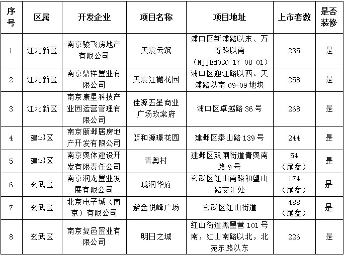分别是江北核心区天宸江樾、天宸云筑、佳源玖棠府,河西颐和源璟、青奥村,新玄武复地明日之城、玄武宝龙城以及紫金悦峯