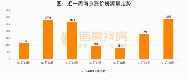 根据诸葛找房数据显示,南京24小时涨价房源量为285套,较07月19日增加106套,环比上涨59.2%。与此同时,涨价房源占比小幅扩大,业主信心有所提升。