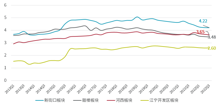 2022年Q3,南京国内生产总值达7800亿元,同比增长1.7%。受疫情影响,写字楼项目入市时间更为审慎,3季度仅华新城T1新增入市,推高市场总存量增至435万平方米。