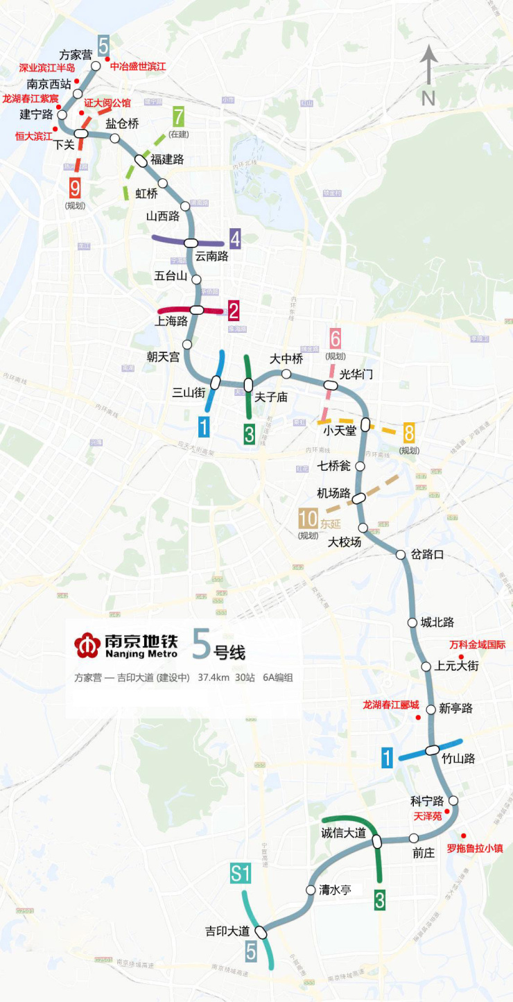 南京地铁5号线起于江宁区吉印大道站,终于鼓楼区方家营站,全部为地下线,共设地下车站30座,计划于2020年底通车,标志色为灰蓝色。