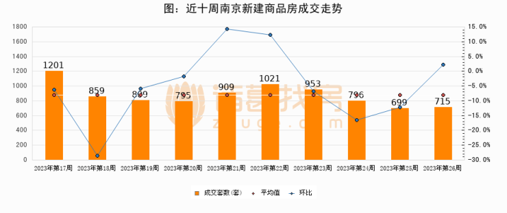 进入2023年第26周(06月19日-06月25日),南京新建商品房成交715套,较上周增加16套,环比上涨2.3%