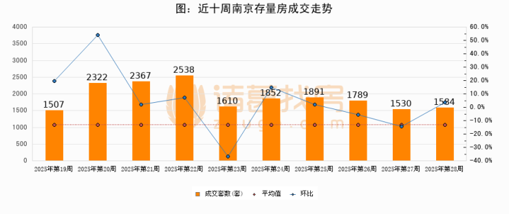 存量房方面,第28周南京存量房成交1584套,较上周增加54套,环比上涨3.5%。从近十周成交走势来看,周均成交套数为1899套,本周低于平均水平16.6%。