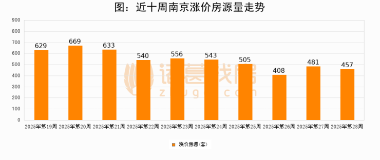 从调价房源来看,第28周南京涨价房源457套,较上周下降5%。与此同时,28周涨价房源占比回落0.05个百分点,业主信心小幅波动,购房者可则需入市。