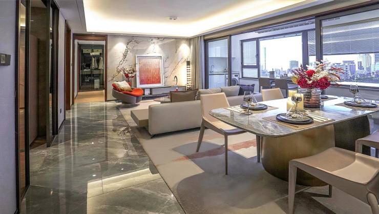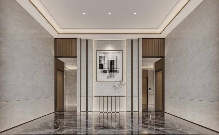 此外,项目采用了酒店和高端写字楼才会用的百年德系蒂升品牌电梯,打造了仪式感满满的环氧地坪、星空穹顶车库和精奢入户大堂。同时,两梯两户的格局设计,相当于每家都是私家门厅,能够有效提升生活私密性以及居住品质。