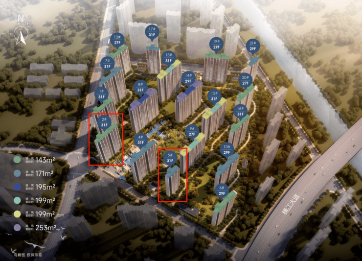 根据规划显示,该项目拟规划建设5栋18-23F住宅,社区内将配建下沉庭院,楼间距40-42m,并且01#、03#有底层架空设计。