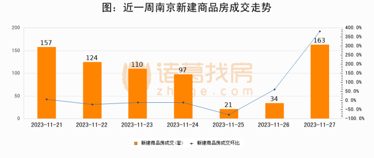 根据南京市住房保障和房产局数据显示,2023年11月27日南京新建商品房成交163套,较昨日增加129套,环比上涨379.4%