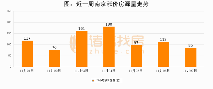 根据诸葛找房数据显示,南京24小时涨价房源量为85套,较11月26日减少27套,环比下降24.1%。与此同时,涨价房源占比小幅回落,对于购房者来说是一个入市窗口期,购房者可抓住时机入市。