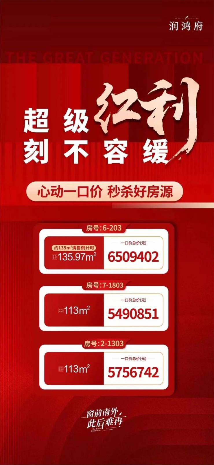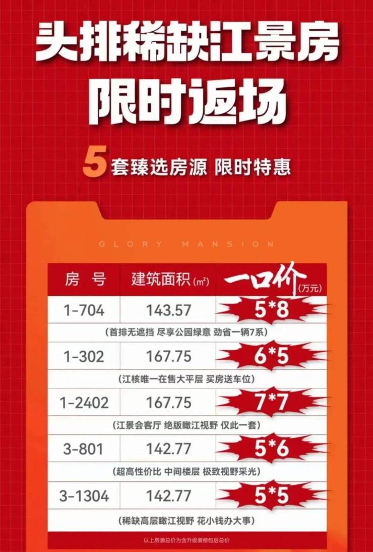 大校场润鸿府113㎡户型总价约550万左右,最高优惠90万!常规楼层优惠50万!而且楼盘也在不间断推出特价房,小户型总价都在500多万。