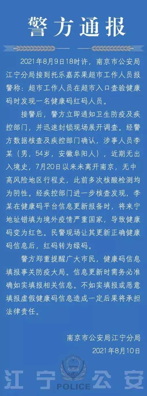 南京一苏果超市查验出红码人员?官方通报:系错填来宁地址
