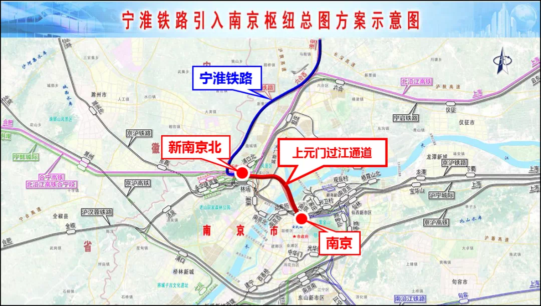 上元门过江通道北接南京北站,南连南京站。通道由南京北站引出,沿浦泗路东行,于桥北污水处理厂处折向南,近南北向过江,江南岸向东南接入规划通道引入南京站。通道正线长度17.6km,其中隧道长14km,总投资173亿。