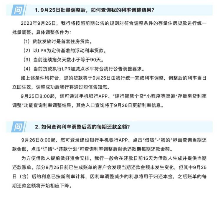 据建设银行9月25日发布的存量房贷利率批量调整问答,9月25日8:00起,客户可通过手机银行APP、“建行智慧个贷”小程序等渠道“存量房贷利率调整”功能查询利率调整结果;其他入口查询将于9月26日更新利率信息。