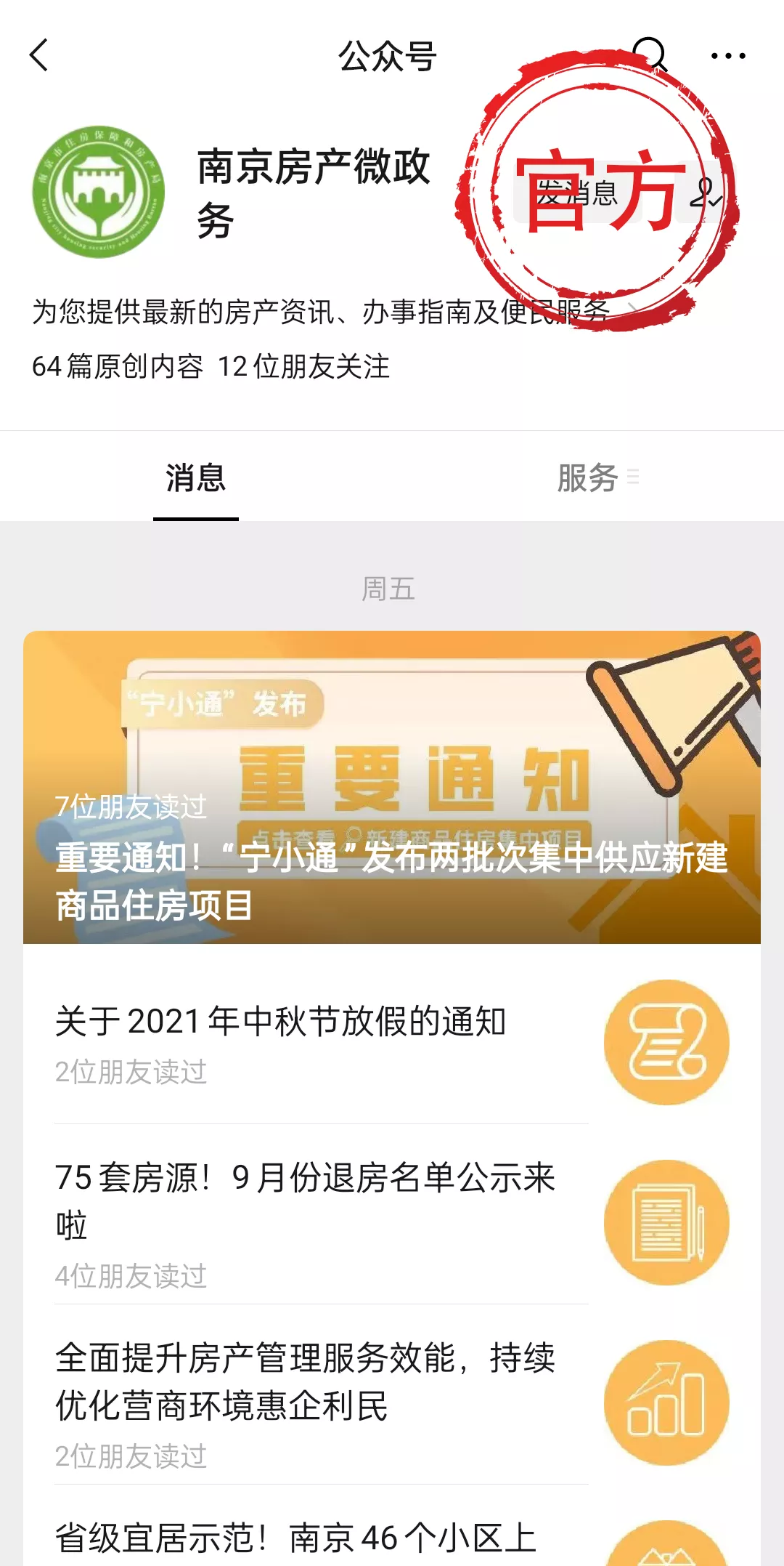 以上为官方未授权个人账号,请广大市民提高警惕。认准“南京房产微政务”官方公众号“宁小通”少有信息发布,少有报名平台。