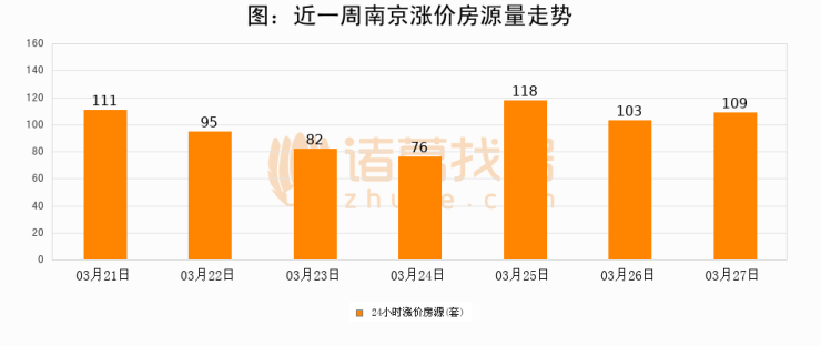 根据诸葛找房数据显示,南京24小时涨价房源量为109套,较03月26日增加6套,环比上涨5.8%。与此同时,涨价房源占比小幅扩大,业主信心有所提升。