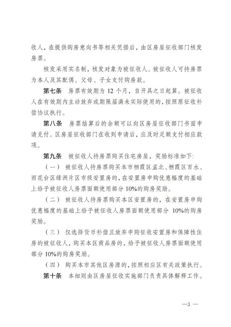 2、持房票购买本市栖霞区孟北、栖霞区百水、雨花台区绿洲片区市级安置房的,在安置房申购优惠幅度的基础上再给予被征收人房票面额使用部分10%的购房奖励。