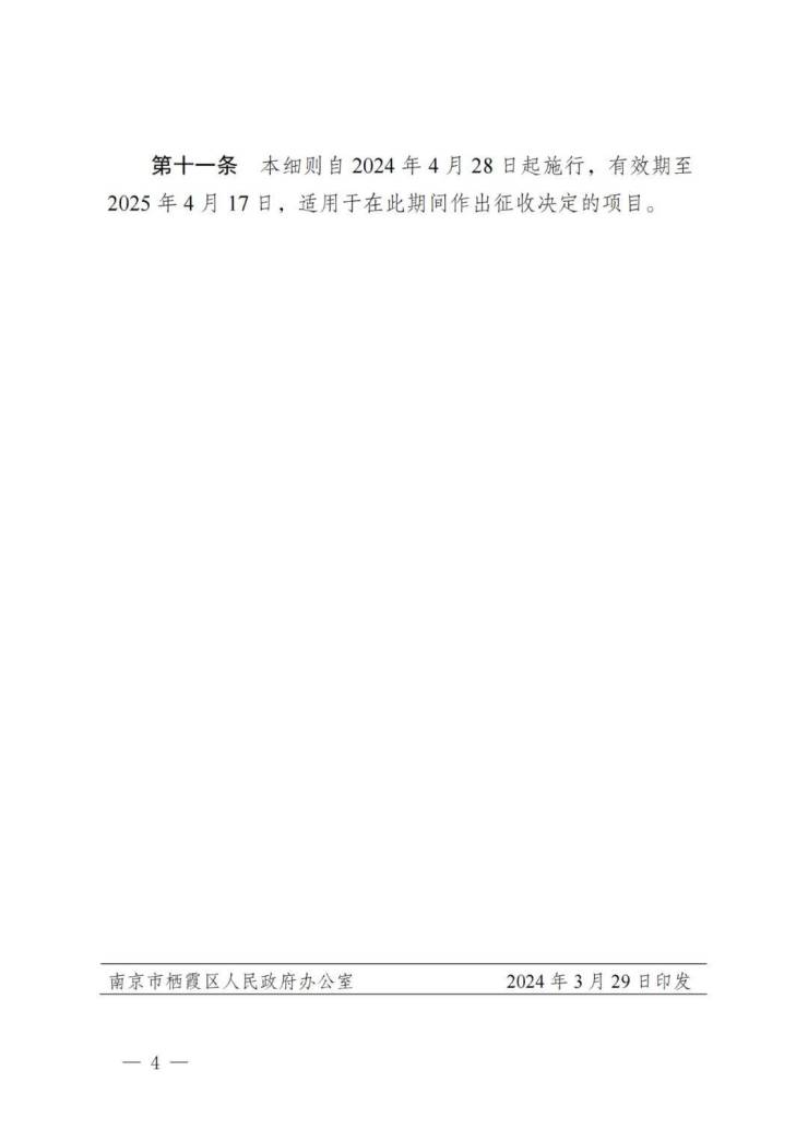 5、细则自2024年4月28日起施行,有效期至2025年4月17日,适用于在此期间作出征收决定的项目。