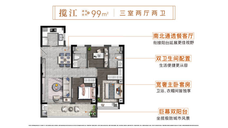 约99㎡三房两卫,小户型三房两卫格局,套内约6.5m南向双阳台,主卧超大飘窗,空间通透,阳光与清风自在拥享。LDK餐客厨一线畅联,生活动线一目了然,聚享全家欢乐时光。