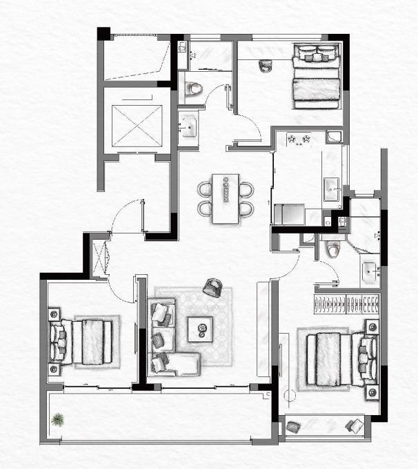 建筑面积约116㎡,三房两卫的纯粹格局,是独属于家庭的私屿。