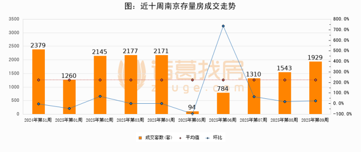 存量房方面,第09周南京存量房成交1929套,较上周增加386套,环比上涨25%。从近十周成交走势来看,周均成交套数为1579套,本周高于平均水平22.2%。